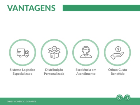 VANTAGENS Sistema Logís co Distribuição Excelência em Ó mo Custo Especializado Personalizada Atendimento Bene cio TANBY COMÉRCIO DE PAPÉIS